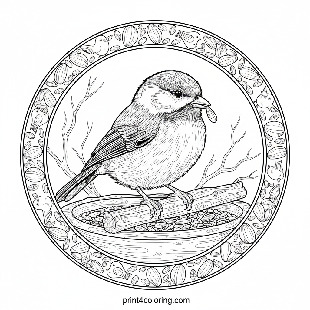 Watch a charming chickadee enjoying a tasty sunflower seed at a rustic bird feeder. This detailed scene shows the tiny bird's focus, surrounded by various seeds and delicate branches. A perfect page to bring nature's beauty to life with your favorite colors, celebrating a small bird's big appetite!