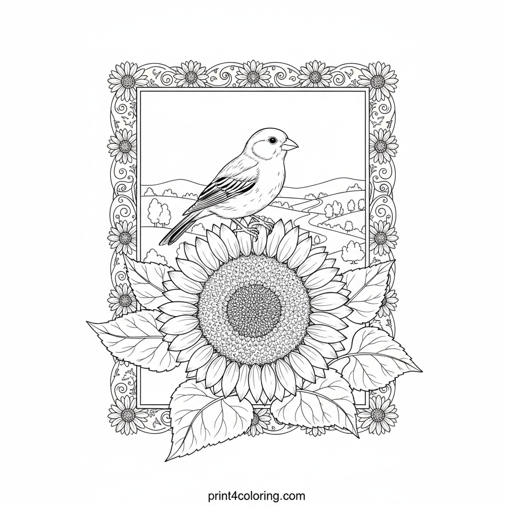 #canary#sunflower#bird#nature#landscape#detailed#giant flower#coloring-page#printable