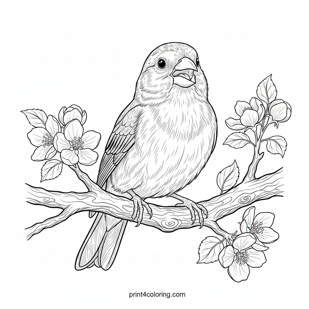 Capture the joy of a spring morning with this detailed coloring page! A cheerful canary, beak open in song, perches on a blossoming apple tree branch. Intricate leaves and delicate flowers surround our little feathered friend, inviting you to bring this beautiful scene to life with your favorite colors.