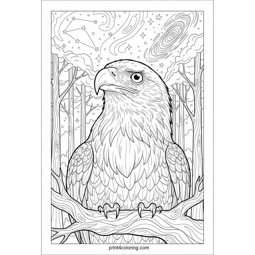 Celestial Sentinel: Star-Gazing Forest Eagle Coloring Page