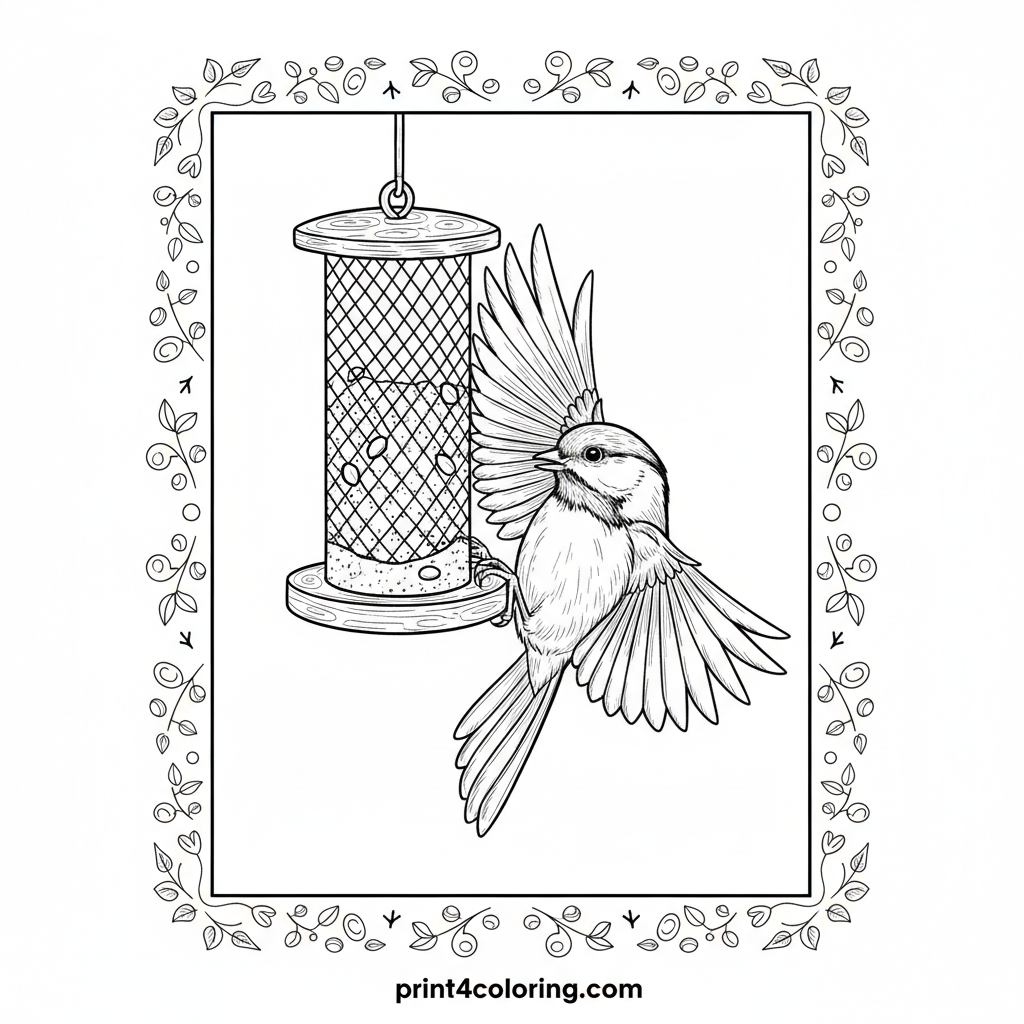 Witness the incredible agility of a chickadee! This expert-level coloring page captures a tiny bird mid-flight, wings spread wide, as it skillfully snatches a seed from a feeder. A detailed pattern frame adds an extra layer of challenge and beauty to this dynamic nature scene, perfect for advanced colorists.