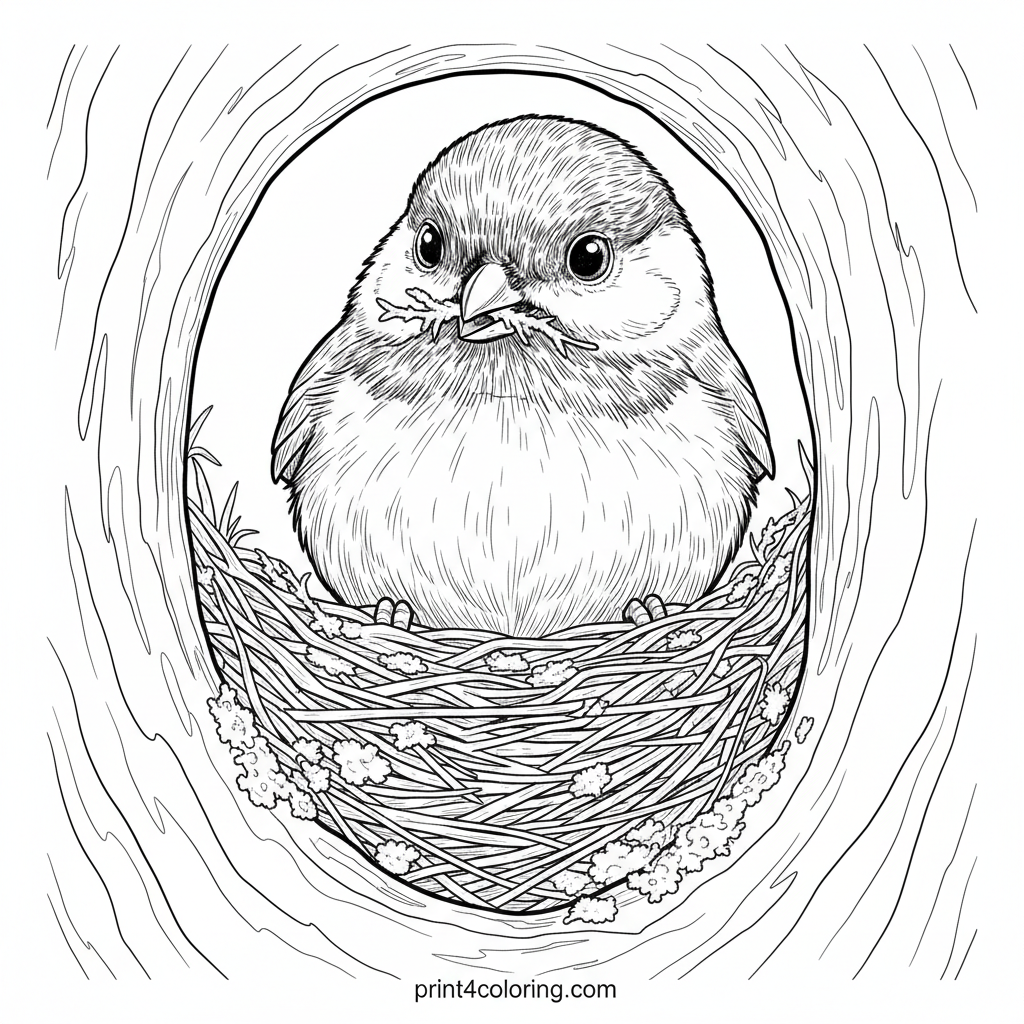 Step into the secret world of a busy chickadee! This detailed coloring page shows a tiny chickadee meticulously arranging soft moss and twigs inside its hidden tree trunk nest. Imagine the cozy home it's building for its future family. A perfect scene for nature lovers to bring to life with color!