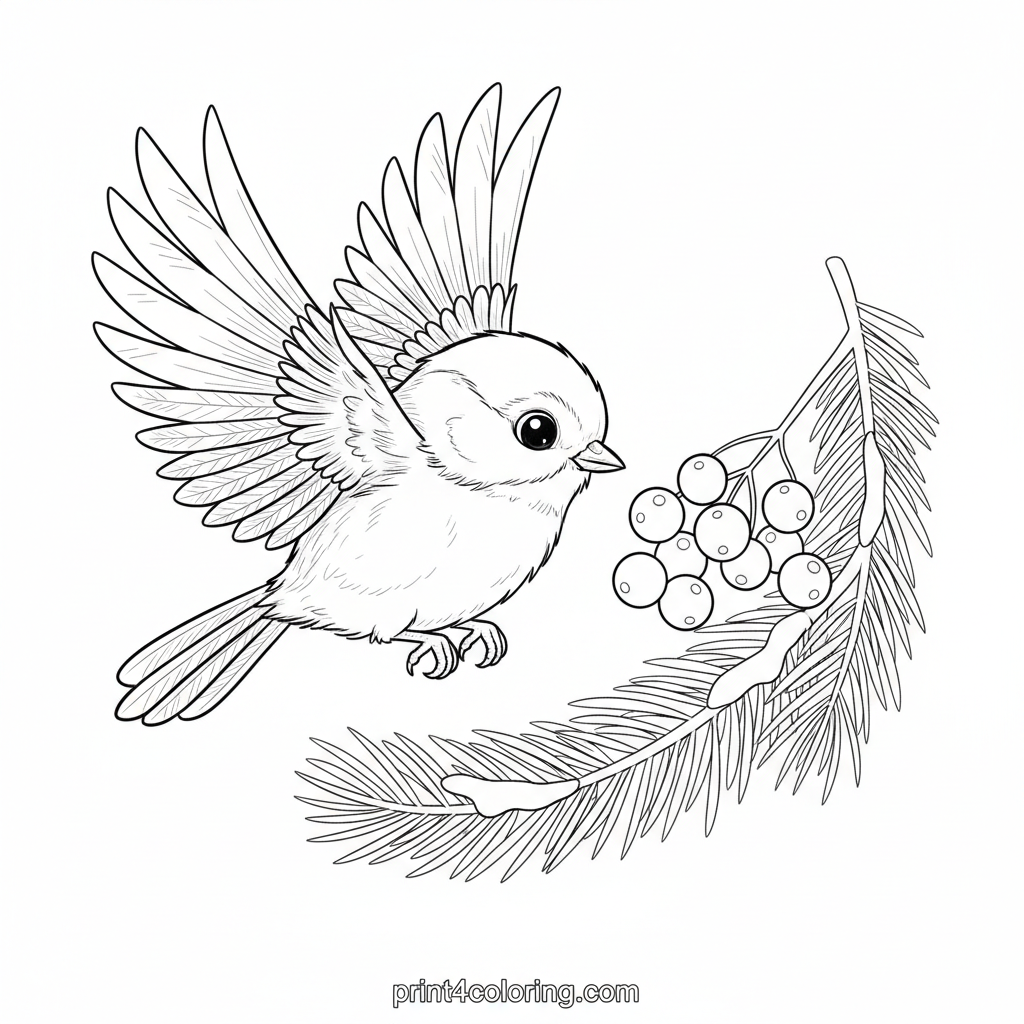 Soar into a winter wonderland with this charming chickadee! Watch as it gracefully glides towards a cluster of vibrant red berries, perched on a snow-dusted evergreen branch. This cozy scene invites you to add beautiful colors to its delicate feathers and the frosty natural setting, creating a delightful winter masterpiece.
