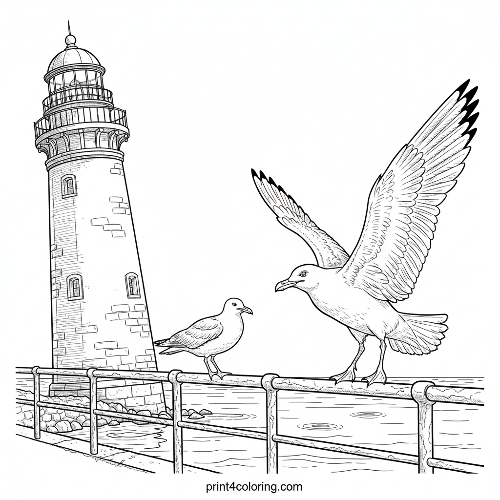 Coastal Guardians: Seagulls on the Lighthouse Coloring Page