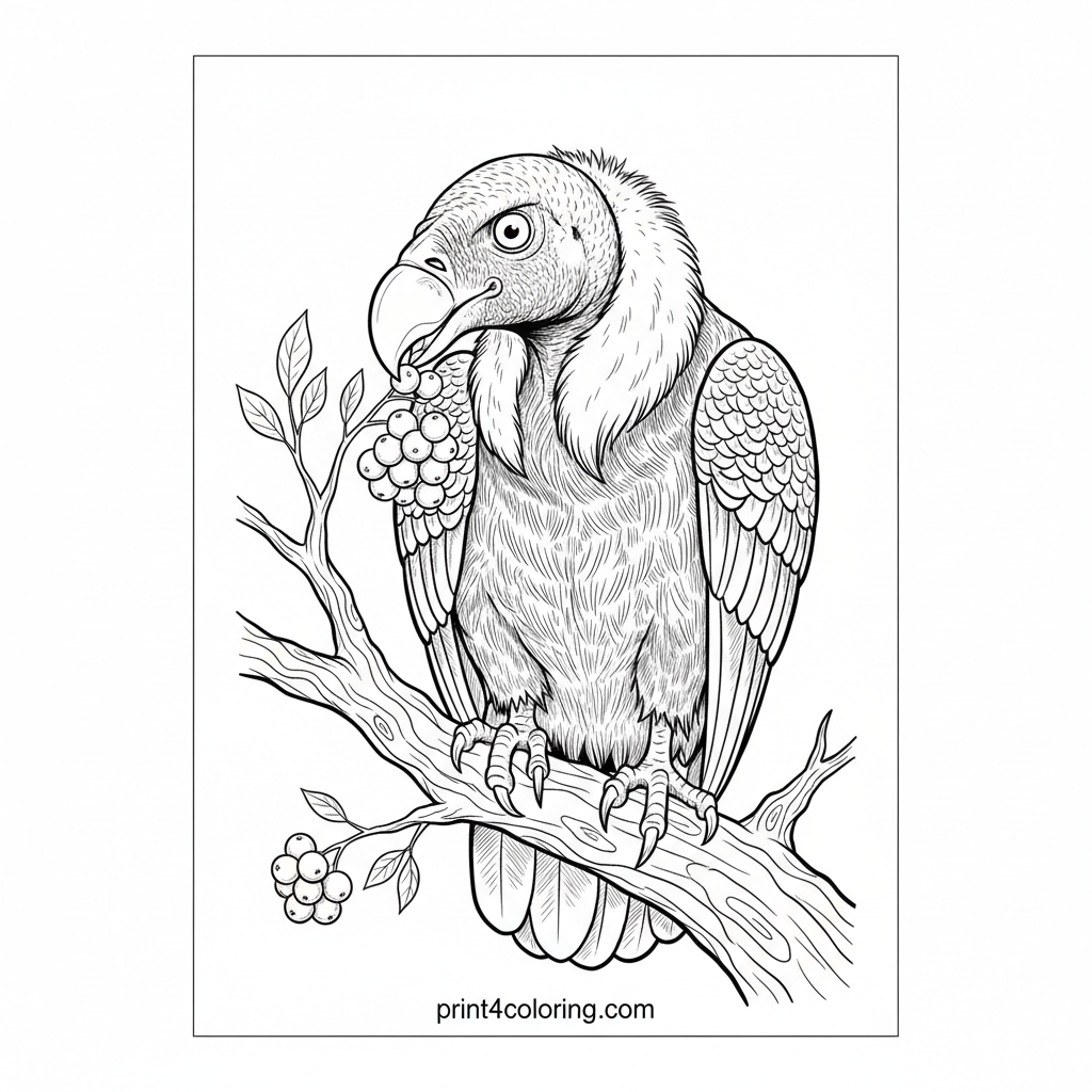 Get ready to color a magnificent condor enjoying a tasty berry feast! This detailed portrait shows the giant bird perched on a gnarled branch, carefully pecking at wild mountain berries. Capture its focused, slightly comical expression and the intricate details of its feathers, the branch, and the juicy berries.