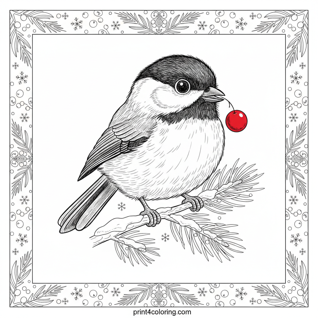 Snuggle up with this delightful coloring page featuring a plump, fluffy chickadee! Perched gently on a snow-dusted pine branch, its large, observant eyes watch the winter world. A single vibrant red berry adds a cheerful pop of color to this cozy scene, inviting you to bring it to life.