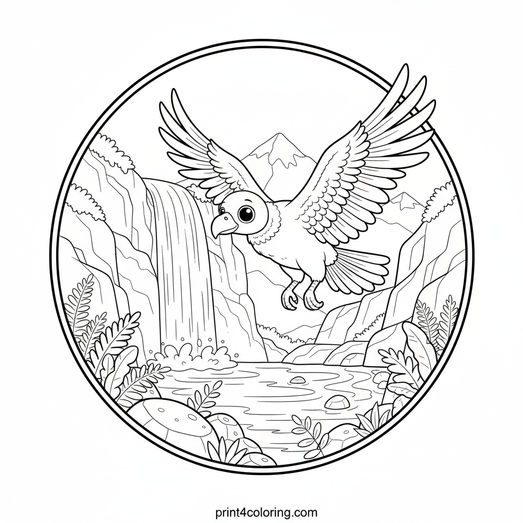 Imagine a powerful condor soaring towards a breathtaking, hidden mountain waterfall. Its waters cascade into a pristine pool, surrounded by lush, detailed plants and ancient rock formations. This scene invites you to color a moment of serene discovery and natural wonder, perfect for cozy coloring.