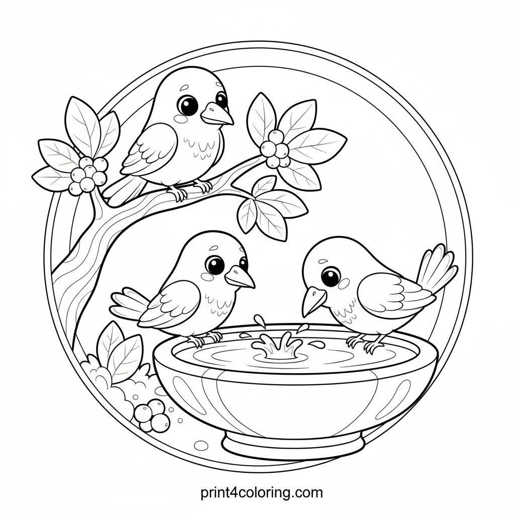 Dive into a charming scene where three friendly crows enjoy a classic stone bird bath. Watch one crow splash playfully, another sip serenely, and the third observe from a leafy branch. This detailed page invites you to bring to life the water ripples, intricate feather patterns, and lush surrounding foliage with your colors.