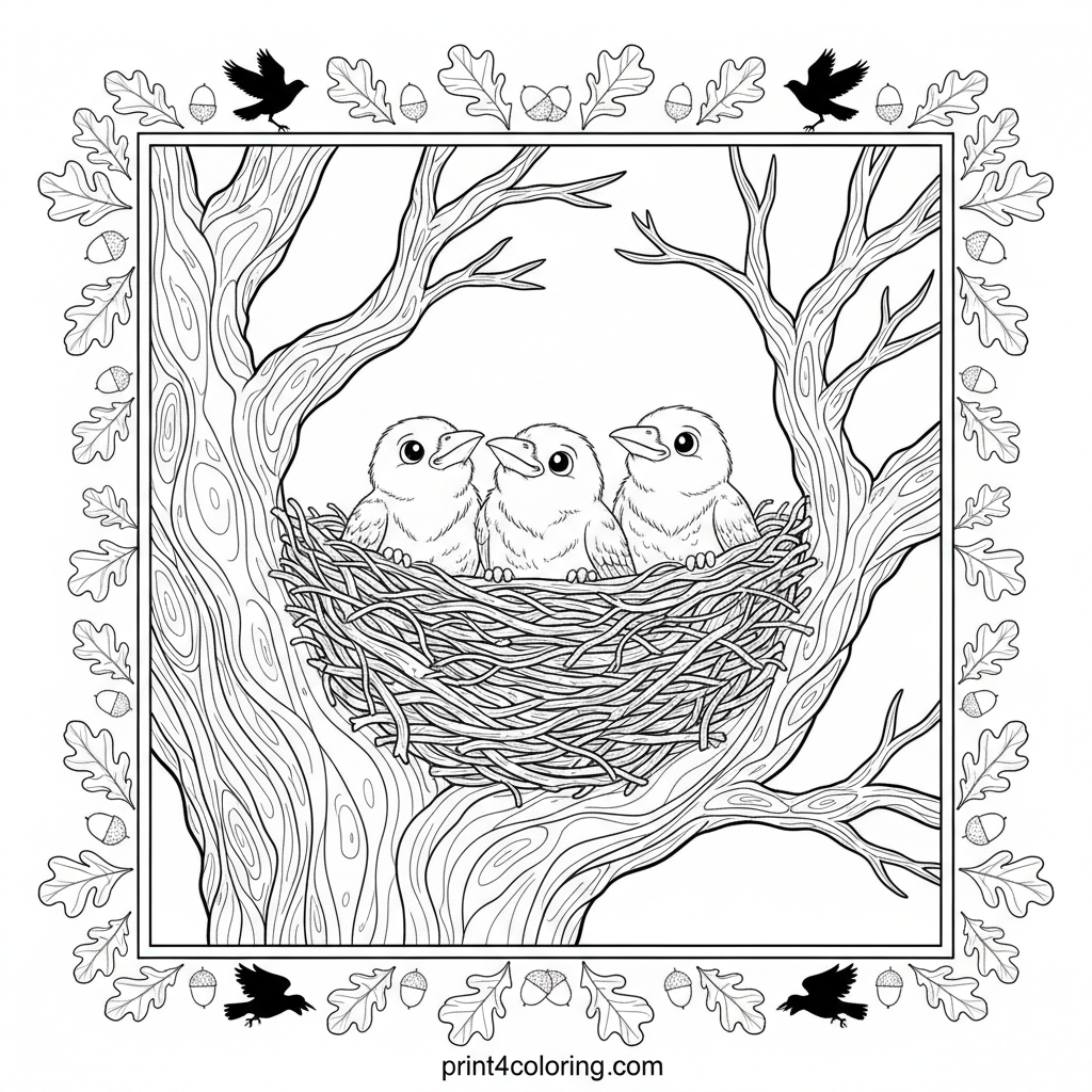 Discover a heartwarming scene high in an old oak tree, where three fluffy baby crows eagerly peek from their intricately woven nest. This detailed page invites you to bring their soft feathers and the sturdy branches to life with your colors. A perfect challenge for expert colorists!