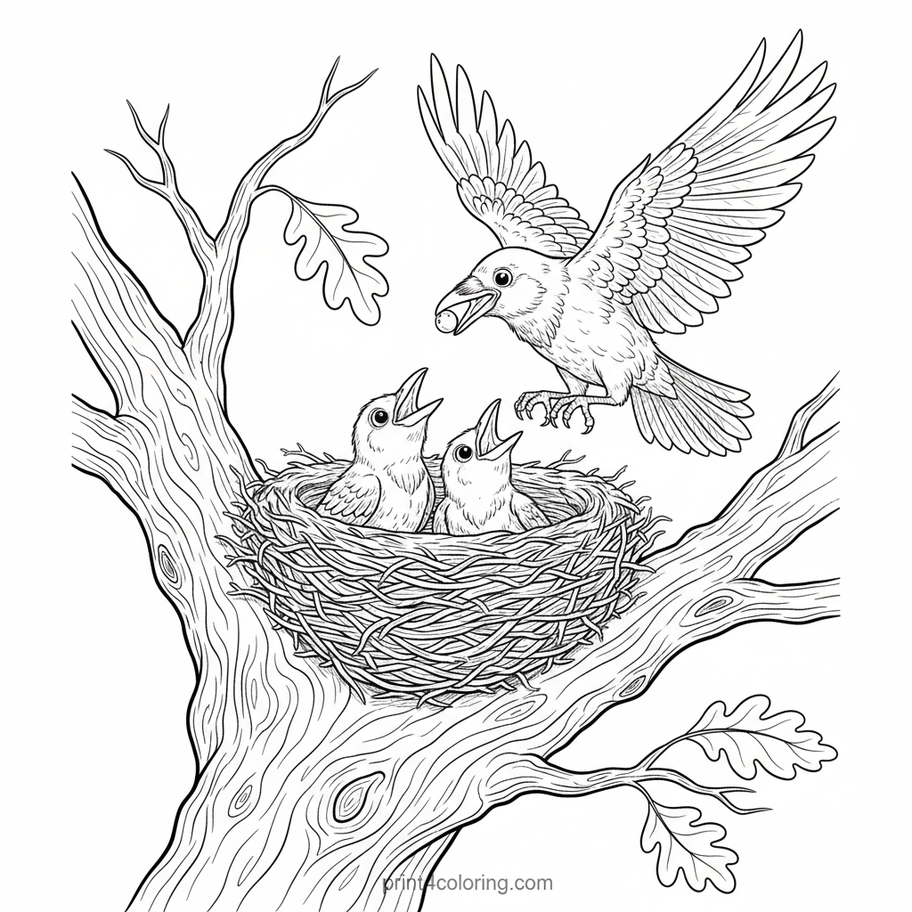 Discover a heartwarming scene high in an ancient oak! Three adorable, fluffy baby crows with big, curious eyes peek from their intricately woven nest, eagerly awaiting their parent's return. This expert-level page features detailed feather textures and the sturdy branches, inviting you to bring this cozy moment to life with vibrant colors.