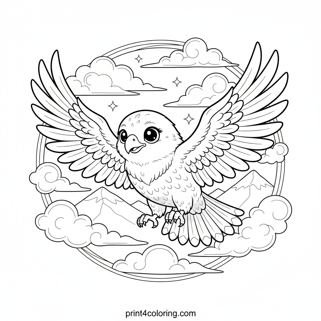 Color a magnificent hawk, wings spread wide, gliding effortlessly above a dreamy landscape. Soft, wispy clouds drift past towering mountain peaks, creating a serene and cozy scene. Capture intricate feather details and its keen focused eyes, bringing this powerful bird's graceful flight to life with your vibrant colors.