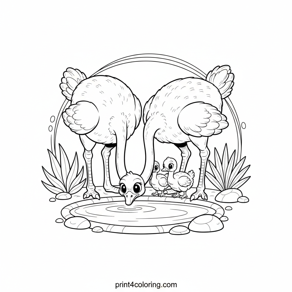 Discover a heartwarming scene at the tranquil waterhole. A majestic male and female ostrich gently guide their two playful chicks as they carefully bend to drink. Lush desert plants and smooth river stones frame this cozy family moment. Get ready for an expert coloring adventure!