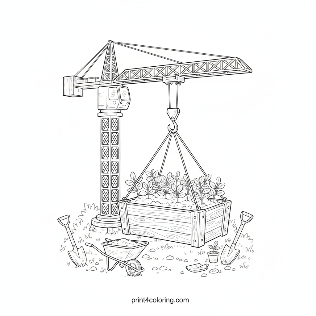 #crane#construction#garden#community#vegetables#planting#machinery#outdoors#cozy#teamwork#coloring-page#printable