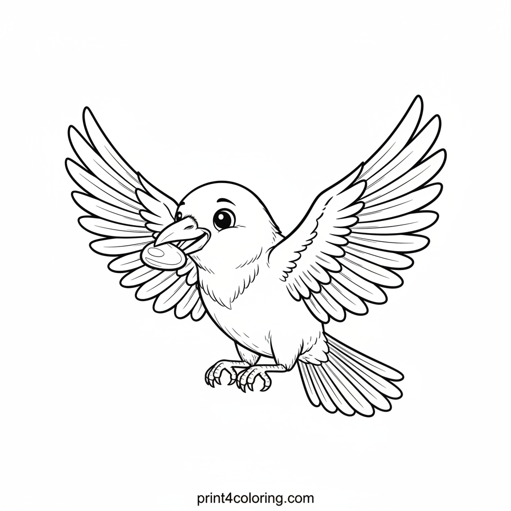 Soar into the sky with this magnificent crow, wings spread wide in powerful flight! Watch as it carries a tiny, gleaming treasure—perhaps a sparkling button or a smooth, bright pebble. This detailed scene invites you to color every feather and capture the magic of its journey.