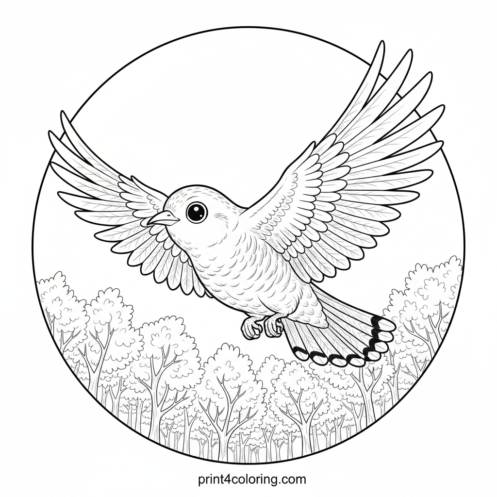 Soar high with this magnificent cuckoo coloring page! Capture the beauty of an adult cuckoo in mid-flight, its wings wide open to showcase every intricate feather. Below, a lush canopy of trees awaits your colorful touch, each leaf a tiny detail to bring to life in this stunning forest scene.
