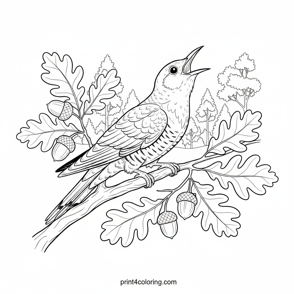 Imagine the sweet sound of a cuckoo bird singing its song! This detailed page features a majestic cuckoo on an oak branch, surrounded by intricate leaves and acorns. A beautiful forest stretches behind, waiting for your vibrant colors to bring it to life. Perfect for nature lovers!