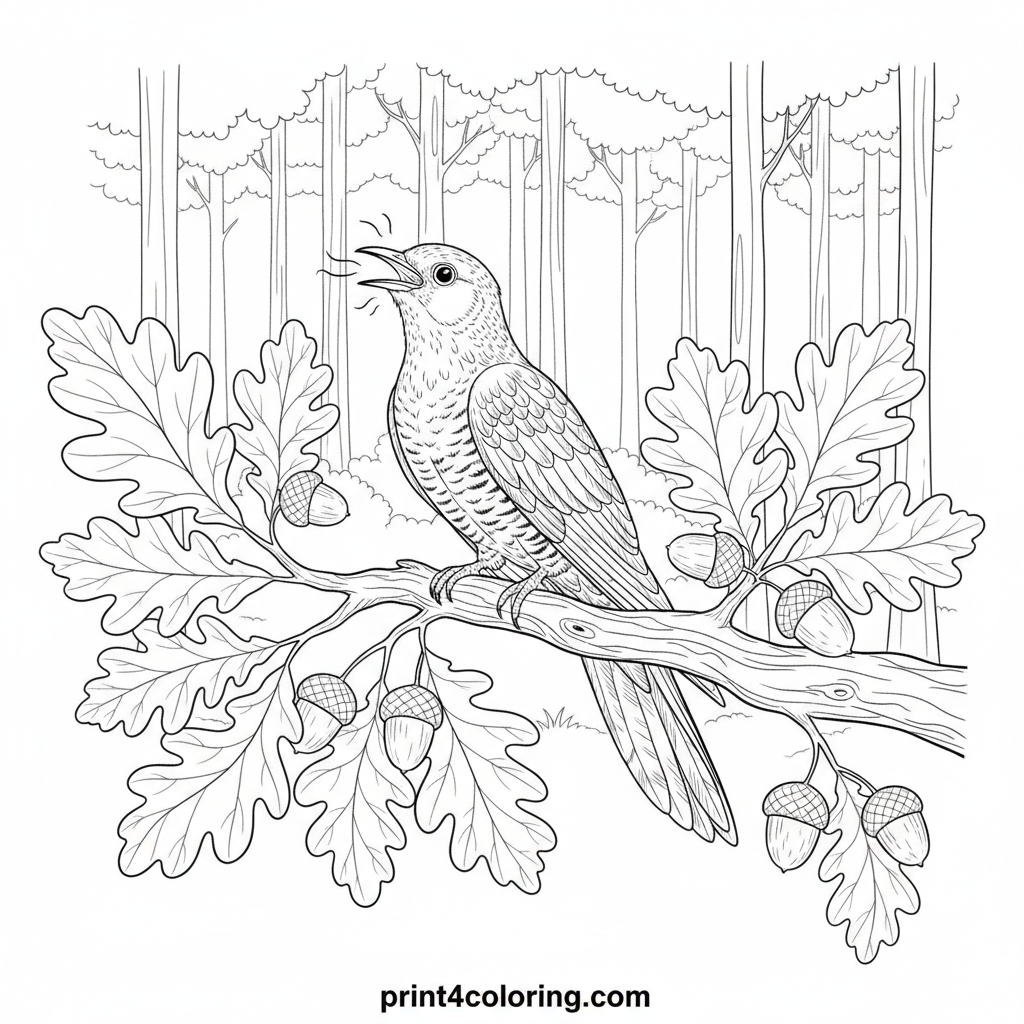 Imagine a majestic cuckoo bird, mid-song, perched on a sturdy oak branch. This expert-level coloring page features intricate oak leaves, detailed acorns, and a serene, deep forest backdrop. Bring this beautiful woodland scene to life with your most vibrant colors, capturing the magic of nature's symphony.