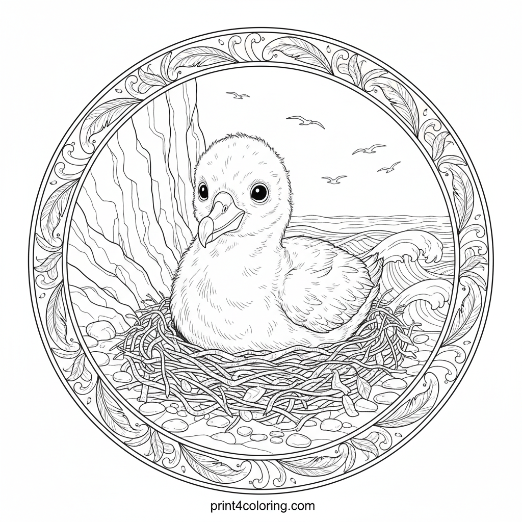 Discover the wonder of a fluffy albatross chick as it peeks from its cozy nest on a rugged cliff. Its big, curious eyes take in the vast ocean and distant seabirds. This expert-level page invites you to bring life to every feather, twig, and wave, capturing a precious moment in nature.