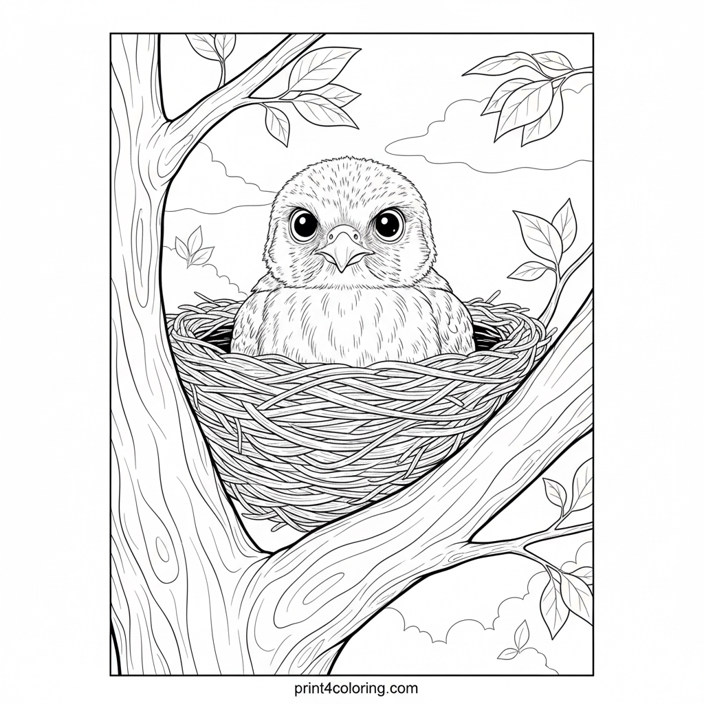 Discover a heartwarming scene featuring a fluffy baby falcon, its large, innocent eyes full of wonder, peeking curiously from its cozy nest. Delight in coloring the soft down feathers and the intricately woven branches, bringing this precious moment of new life in nature to your page.