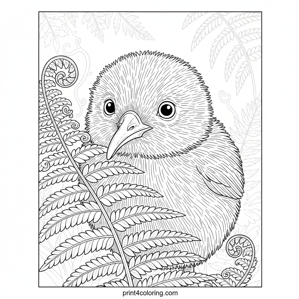 Curious Baby Kiwi's Fern Hideaway Coloring Page