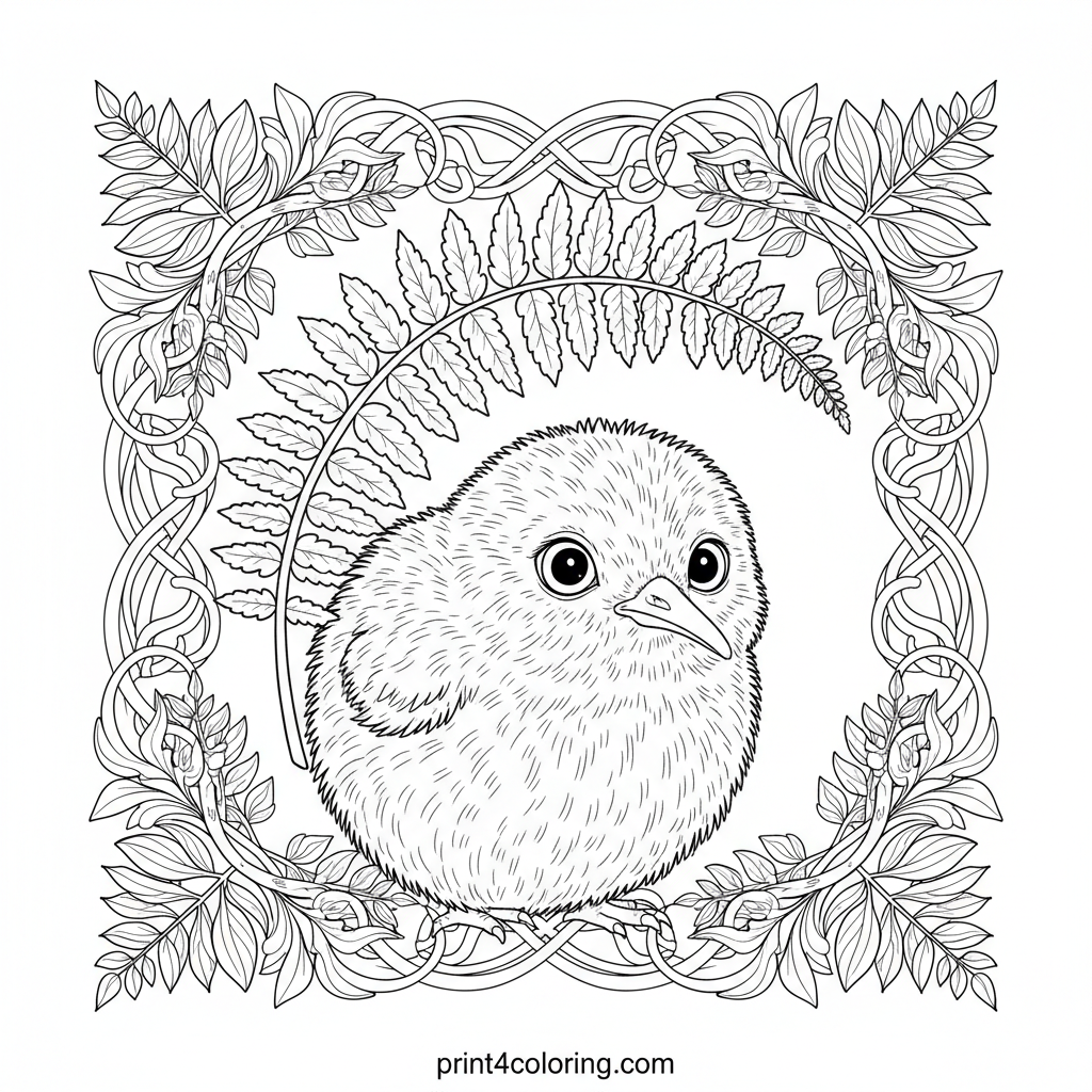 Discover a charming baby kiwi, soft and round, peeking with big, curious eyes from behind a detailed fern. Its long beak hints at its presence amidst lush New Zealand foliage. This intricate scene, featuring silver ferns and supplejack vines, invites you to bring the magic of the forest to life with your colors!