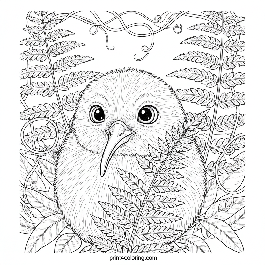 Discover a super fluffy baby kiwi bird playing peek-a-boo! With big, curious eyes, it peeks from behind a detailed fern frond. The background is filled with realistic New Zealand native plants like elegant Silver Ferns and winding supplejack vines, creating a cozy forest scene perfect for coloring.