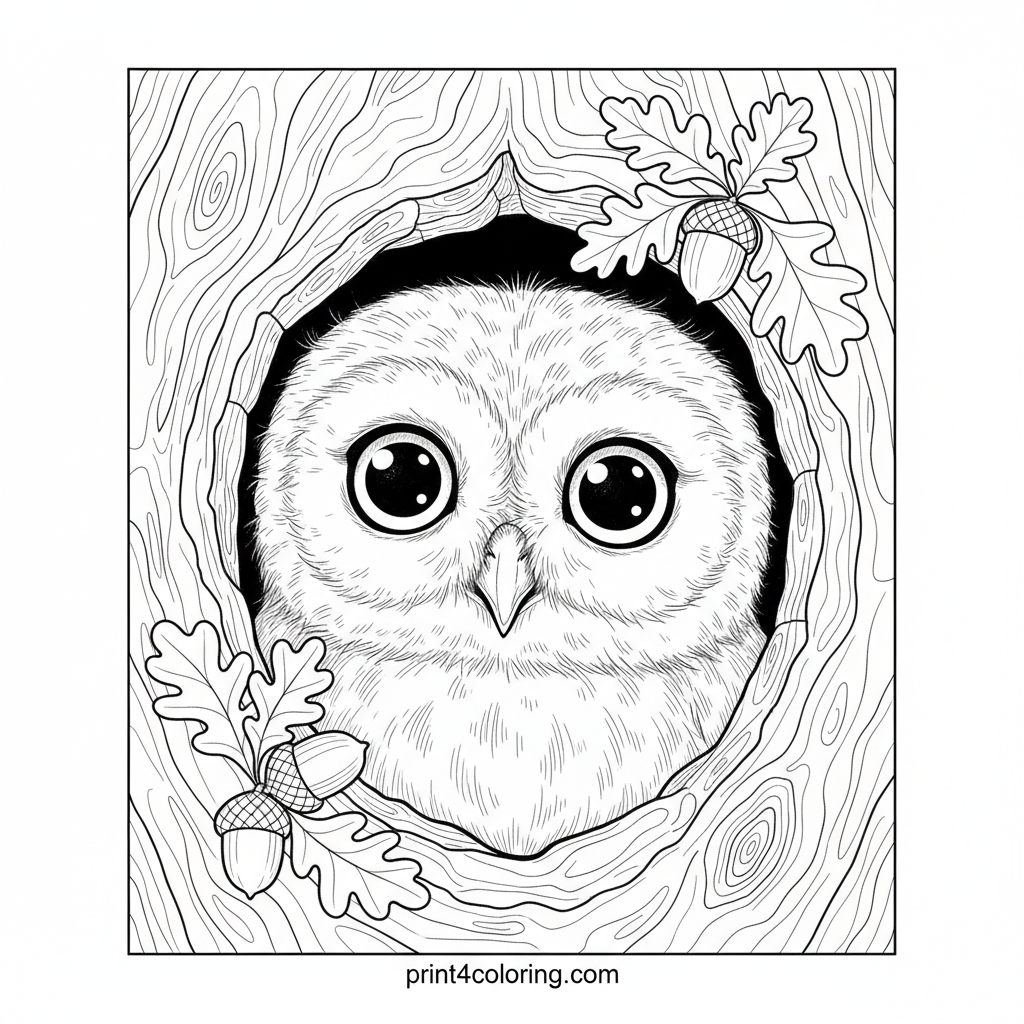Discover a fluffy baby owl with big, innocent eyes, peeking out from its snug tree hollow. Intricate oak leaves and acorns frame this adorable scene, waiting for your creative colors to bring it to life. A perfect challenge for expert colorists!