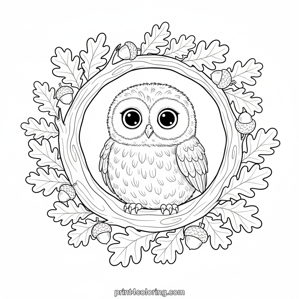 Meet an adorable baby owl, peeking with wide, innocent eyes from its snug tree hollow. This fluffy little one is surrounded by beautifully detailed oak leaves and acorns on a sturdy branch. Perfect for a cozy coloring adventure, bringing this sweet forest friend to life with your favorite colors.