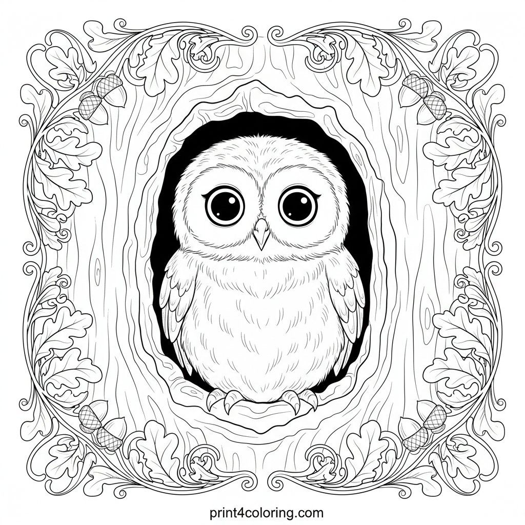 Discover an adorable baby owl, with large, curious eyes, peeking out from its snug tree hollow. This intricate coloring page features delicate oak leaves and acorns forming a beautiful natural frame, inviting you to bring the woodland scene to life with your favorite colors. Perfect for nature lovers!