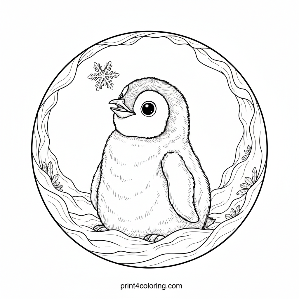Dive into a heartwarming winter scene! A fluffy baby Emperor Penguin chick, with big, wondering eyes, gazes at a single, perfect snowflake drifting towards its beak. Surround this adorable moment with soft, detailed snow, ready for your creative colors.