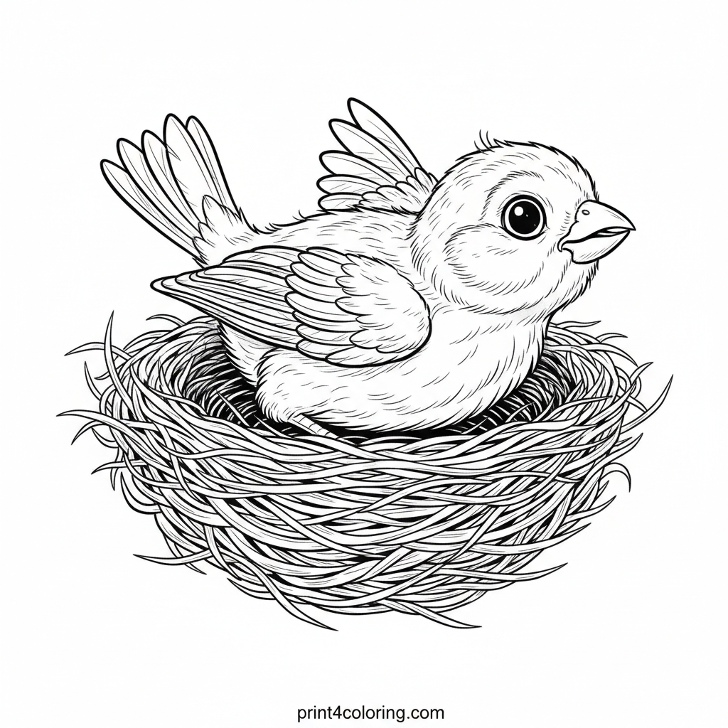 Discover the wonder of a fluffy baby canary, peeking with wide, curious eyes from its cozy, intricately woven nest. This detailed scene invites you to color the soft downy feathers and the rich textures of its new home, capturing a precious moment of discovery as it takes its first look at the world.