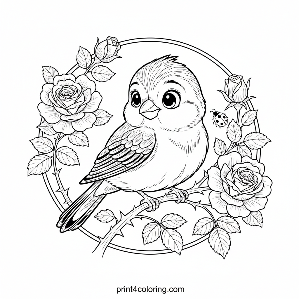 Explore a charming scene where a curious canary, with its delicate feathers, gently perches on a thorny rose branch. Intricate rose blooms and detailed leaves frame the bird as it tilts its head, observing a tiny ladybug on a soft petal. A beautiful, detailed adventure awaits your colors!