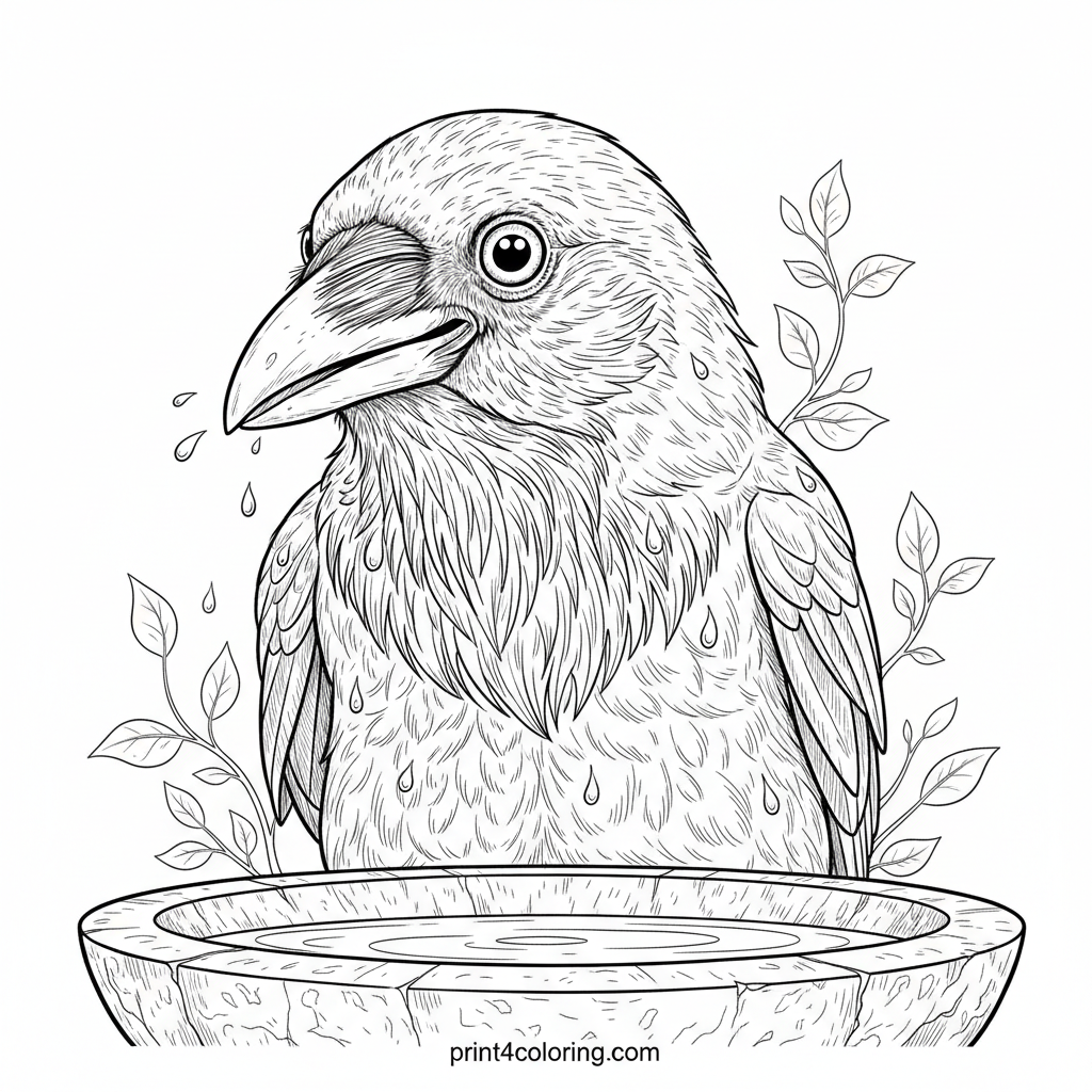 Dive into a detailed scene where three friendly crows enjoy a refreshing moment at a classic stone bird bath. Watch one splash, another sip, and the third observe from a leafy branch. Explore intricate feather patterns, gentle water ripples, and lush foliage, ready for your artistic touch!