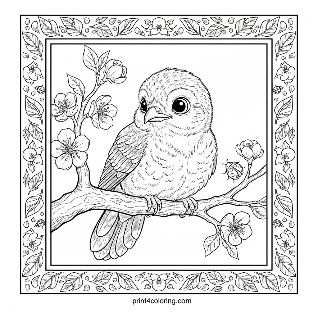Meet a fluffy cuckoo chick with big, curious eyes, delicately perched on a blossoming branch. It's intently watching a tiny ladybug on a nearby leaf! This expert-level page features realistic feather and tree bark details, inviting you to bring this intricate scene to life with your favorite colors.