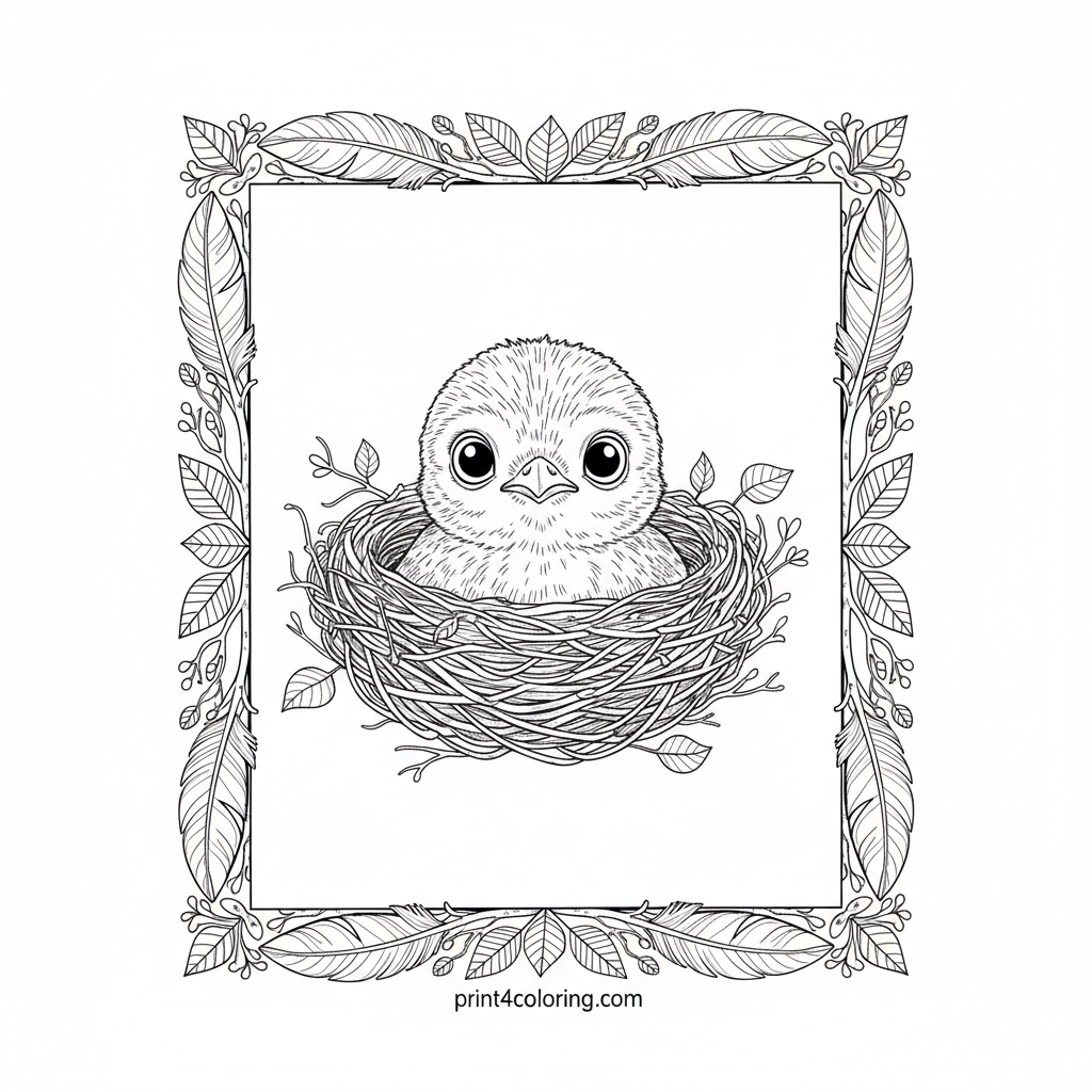 Meet a tiny, fluffy cuckoo chick peeking over its cozy, meticulously woven nest! With big, innocent eyes, this little bird is full of wonder, ready to discover the world. Delicate leaves and twigs frame this adorable scene, inviting you to add vibrant colors to its first adventure.
