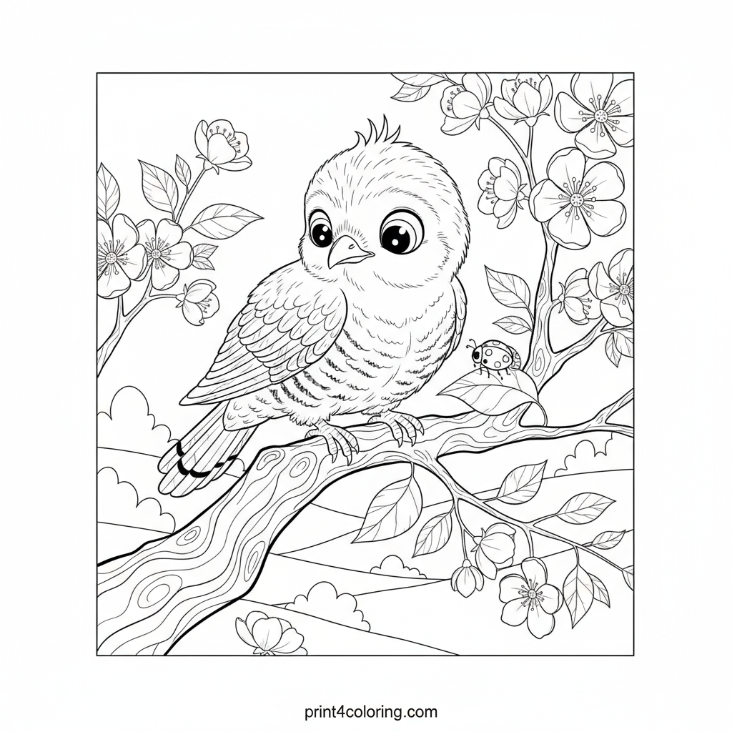 Discover a fluffy cuckoo chick with big, curious eyes, perched gently on a blossoming branch. Watch as it gazes intently at a tiny ladybug on a nearby leaf. This expert page features intricate details on soft feathers and rough tree bark, inviting you to bring this charming nature scene to life.
