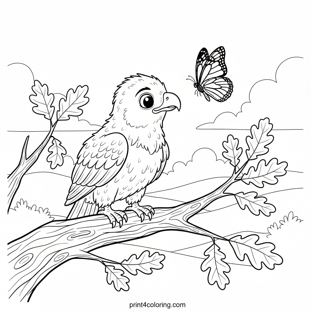 Discover a charming scene where a fluffy fledgling eagle, perched on a mighty oak branch, gazes with wide, curious eyes at a vibrant monarch butterfly. This detailed page captures the intricate textures of feathers, bark, and leaves, inviting you to bring this moment of discovery to life with your colors. A perfect challenge for expert colorists!