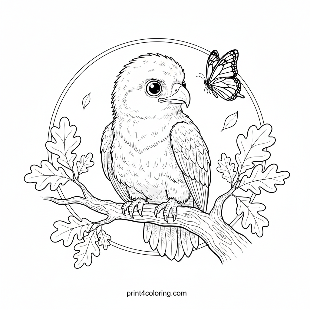 Discover a heartwarming scene with a fluffy fledgling eagle perched securely on a sturdy oak branch. Its big, curious eyes are fixed on a beautiful monarch butterfly fluttering just out of reach. This detailed page invites you to color intricate tree bark and lush leaves, bringing this cozy moment to life.