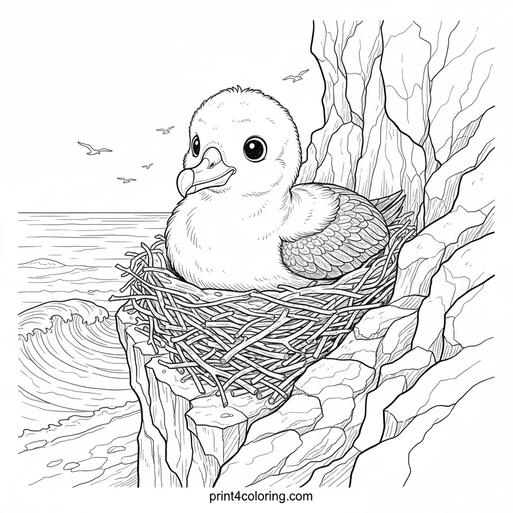 Color an adorable, fluffy albatross chick peeking from its cozy nest! Perched high on a rugged cliff, this little one has big, curious eyes, taking in the vast ocean and distant seabirds for the first time. Imagine the salty air and waves as you bring this heartwarming scene to life!