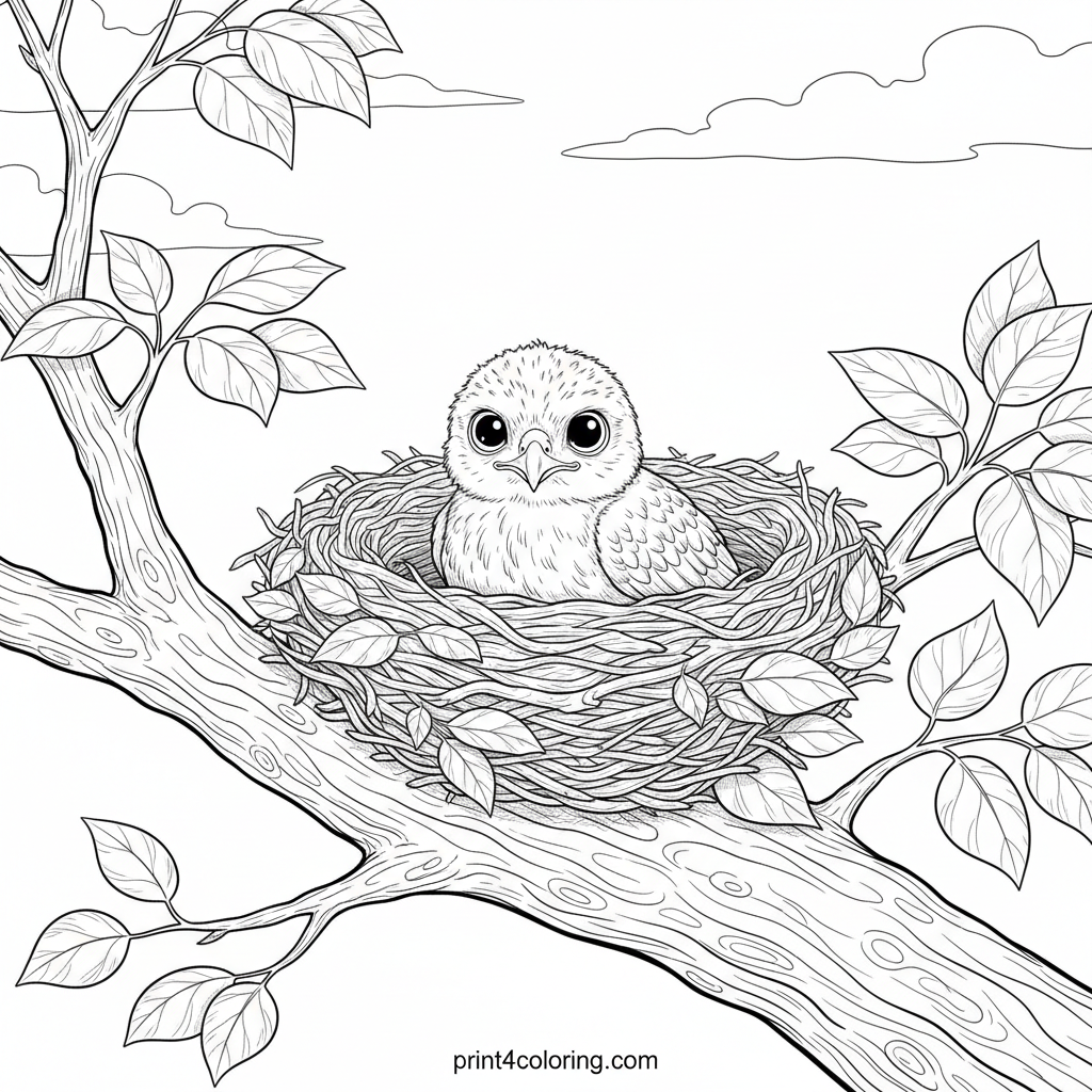 Welcome to the world of a brand new baby hawk! This detailed scene features a fluffy, wide-eyed hatchling peeking cautiously from its cozy twig nest, perched high in a strong tree. Capture the wonder of nature with surrounding leaves and a hint of the vast sky, perfect for an expert colorist.