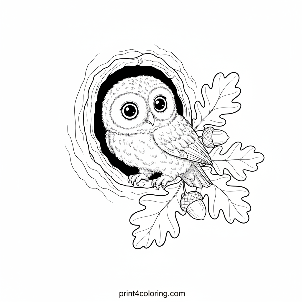 Discover a fluffy baby owl with wide, innocent eyes, curiously peeking from its snug tree hollow. Intricate oak leaves and acorns adorn the sturdy branch, inviting you to add vibrant colors to this adorable woodland scene. Imagine the soft feathers and the warm, earthy tones of its cozy home.