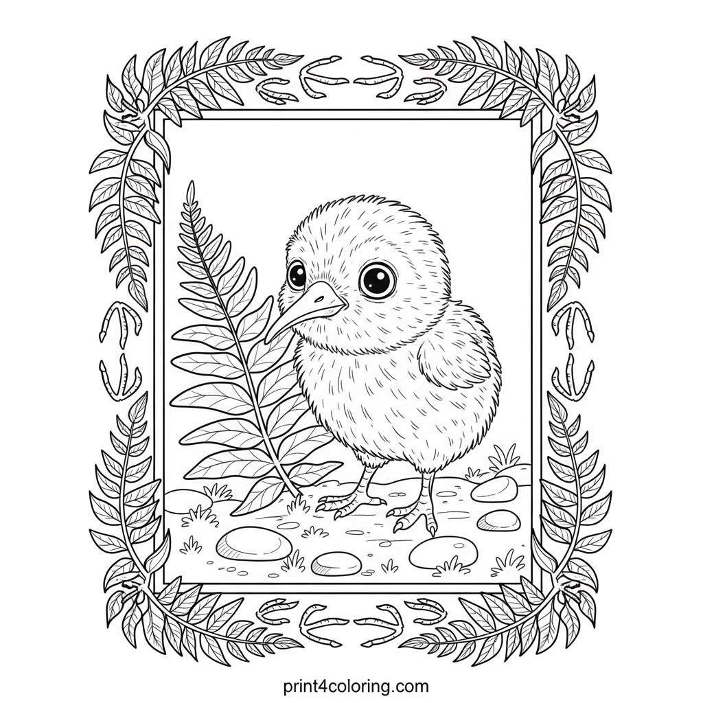 Curious Kiwi Chick in the Fern Forest Coloring Page