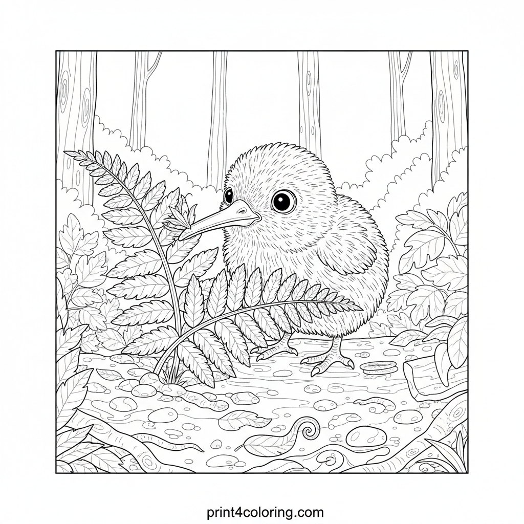 Discover a fluffy, big-eyed baby kiwi chick peeking shyly from behind a grand fern leaf. Its long beak sniffs the air in a lush, detailed forest. Imagine the sounds and smells of its home as you bring this curious creature and its intricate surroundings to life with your colors.