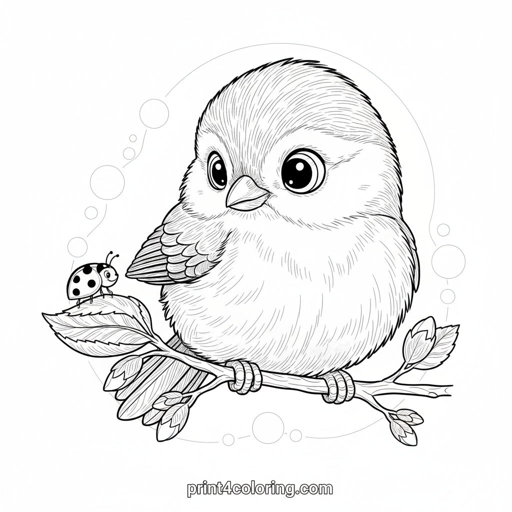 A charming young chickadee with big, curious eyes gently perches on a budding branch, captivated by a tiny ladybug. Explore intricate feather details and delicate botanical elements in this cozy spring scene, perfect for nature lovers and detailed coloring.