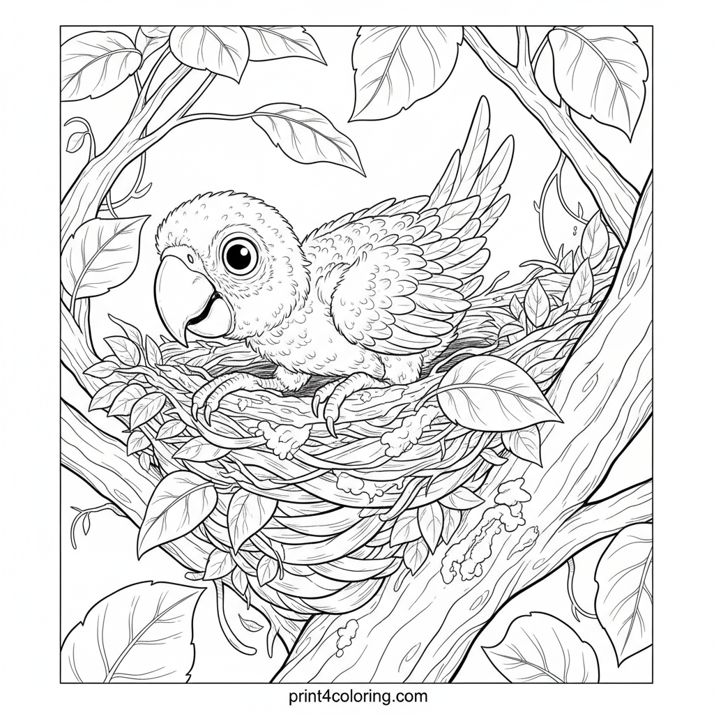 Curious Nestling: Baby Macaw's Rainforest Peek Coloring Page