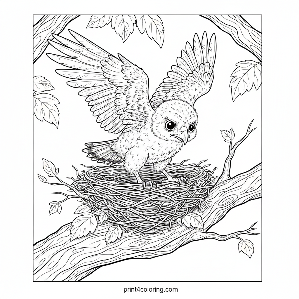 Discover the wonder of a fluffy baby hawk, a nestling, as it peeks out from its snug nest. With wide, curious eyes, it takes in the world from a high tree branch, surrounded by intricate leaves and a hint of the vast sky. This expert-level page invites detailed coloring.