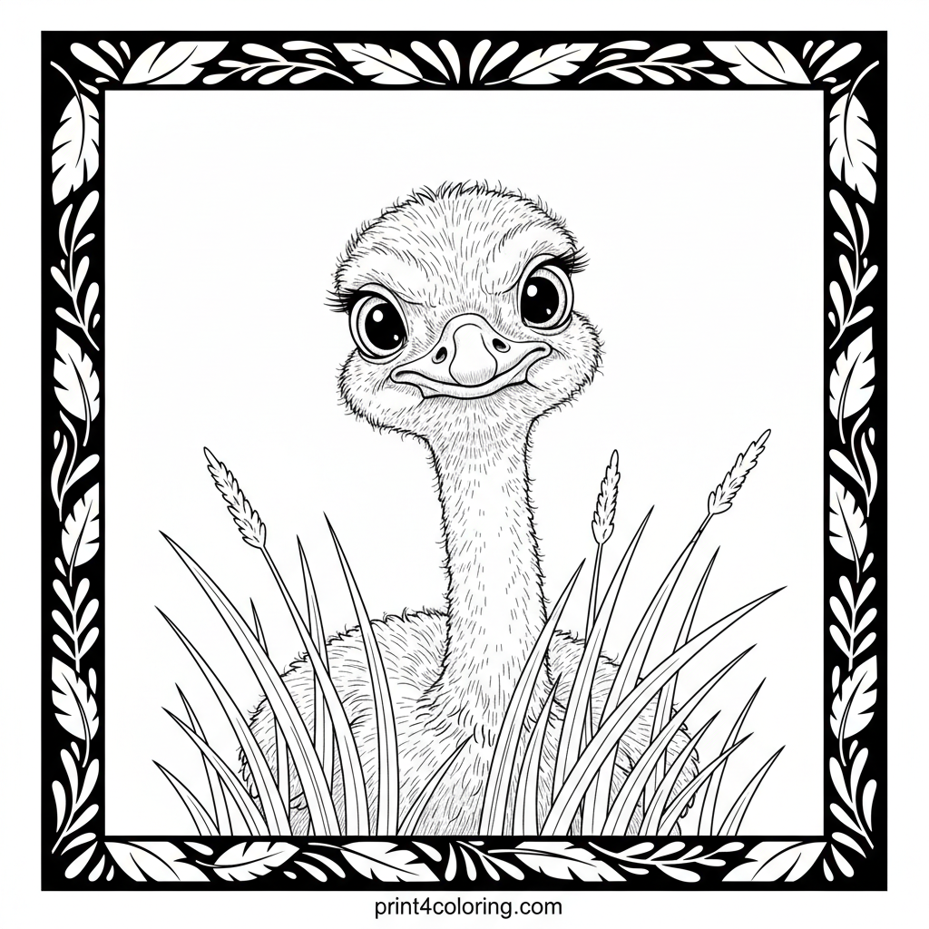 Meet a fluffy, wide-eyed ostrich chick, fresh out of its shell and full of wonder! This little explorer peeks from behind tall savanna grass, its long neck stretched to see the big world. The scene is framed by a delightful, repetitive pattern, adding an extra layer of fun for young artists to color and discover.