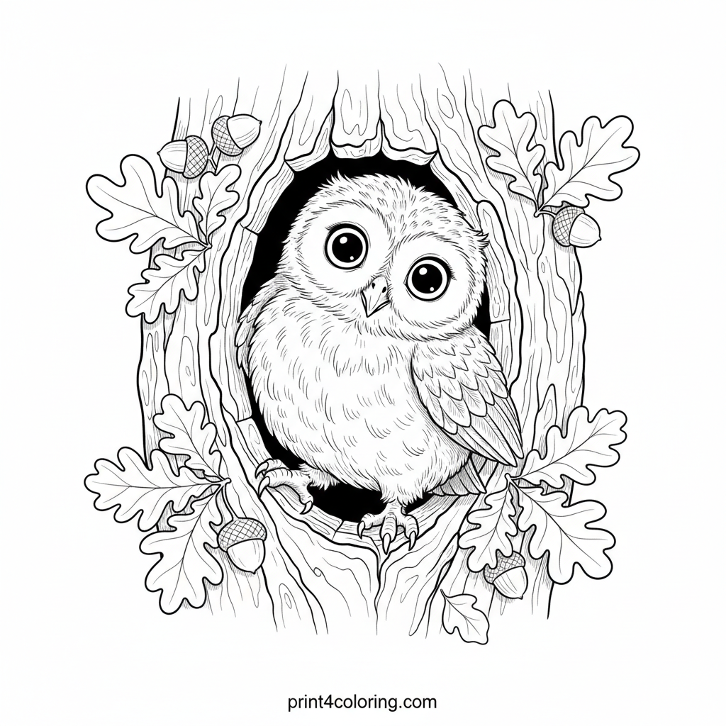 Discover a fluffy, wide-eyed baby owl peeking out from its cozy tree hollow! This adorable owlet, with its soft downy feathers, is surrounded by beautifully detailed oak leaves and acorns, creating a charming woodland scene. A perfect page for nature lovers to bring to life with vibrant colors.