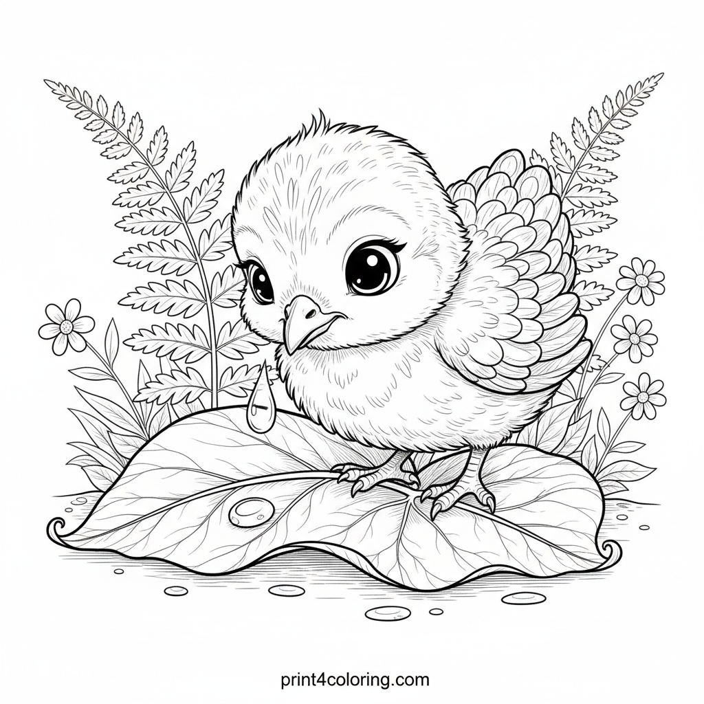 Join a fluffy young peachick as it discovers the shimmering magic of a dewdrop on a giant, detailed leaf. This cozy scene features soft botanical elements like ferns and wildflowers, inviting you to add vibrant colors to its world. A charming illustration perfect for nature lovers!
