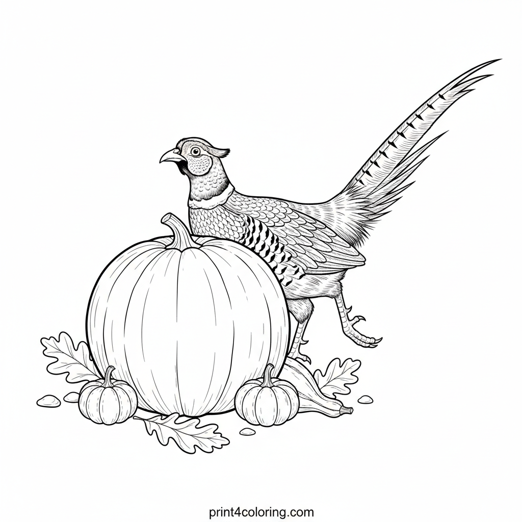 Join a magnificent male pheasant as he cautiously peeks around a giant pumpkin in a charming autumn patch. His vibrant feathers and long tail stand out against the rustic backdrop of fallen leaves and tiny gourds. This detailed scene invites you to bring the beauty of harvest time and wildlife to life with your colors.